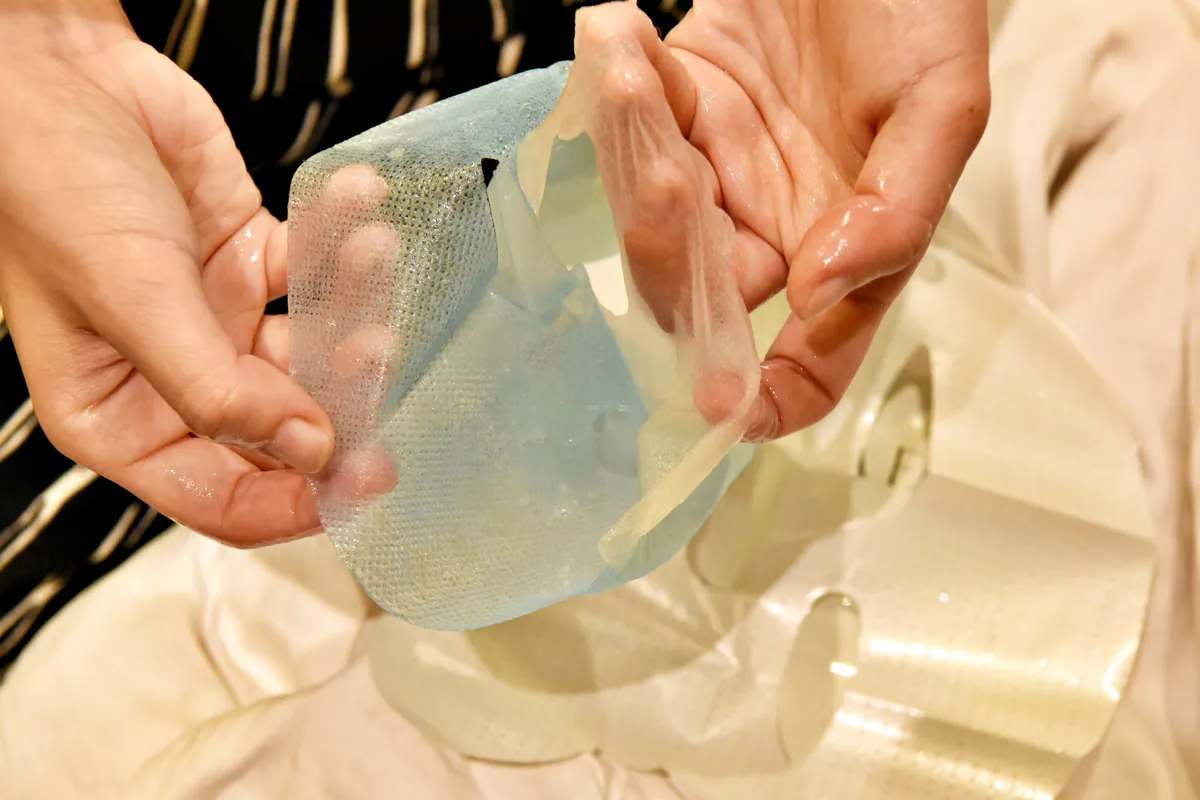 我手上那層薄薄的透明膜,就是萊慕思的面膜,質地很細緻,很像張假皮!