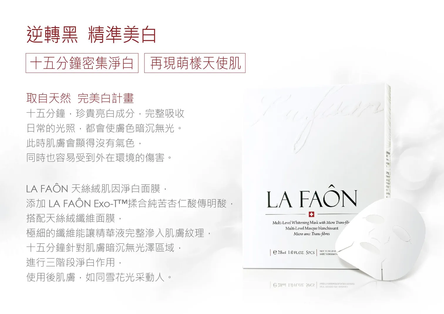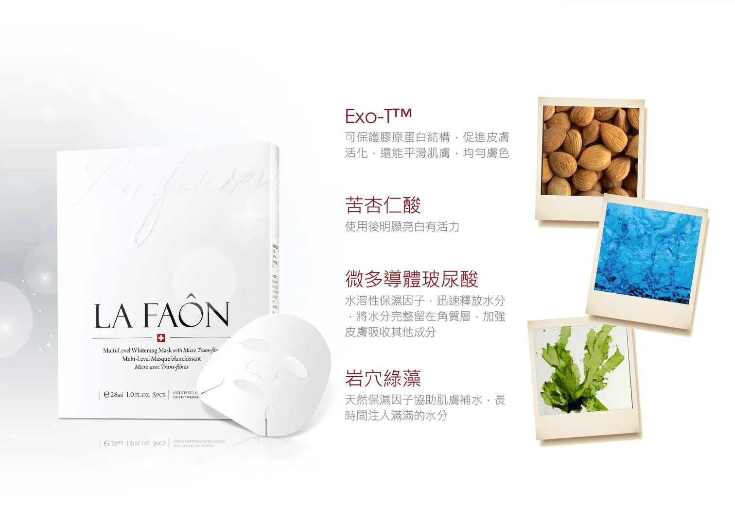 添加傳明酸、苦杏仁酸、乙基維他命C、岩穴綠藻,特別添加LA FAON亮白成分Exo-T™,協同微多導體玻尿酸,讓亮白效果加倍,更加水嫩動人。